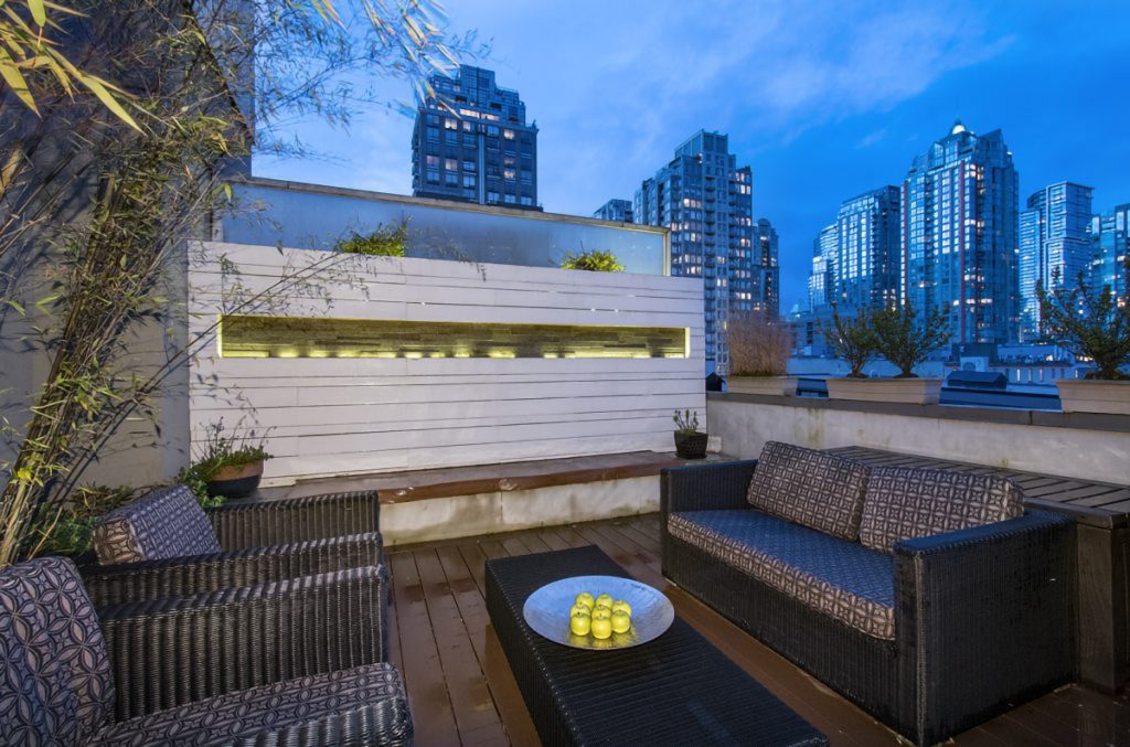 Rarely do one of the sought-after penthouses come up in this iconic Crandall building in Yaletown. This 2 bedroom, 2 bath light-filled home boasts soaring 10’ high ceilings & a wonderful floorplan that provides exceptional flow for entertaining & living. This home oozes approachable luxury. Luxurious finishes & custom millwork enhances the timeless elegance of the home, with mindful details such as the sparkle of the jade stone counters, the light-filled baths enveloped in exotic stone & glass, the jewel-like sparkle of the European bathroom fixtures, air conditioning, walls of EuroTilt windows, motorized blinds. The best part is the dream 300 sqft terrace via double glass doors off the kitchen, professionally landscaped with gorgeous black bamboo, concrete planters & beautiful lighting.